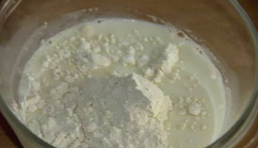 - Verwarm de melk een beetje, voeg gist en 250 gram gezeefde bloem toe, roer en laat het mengsel een half uur op een warme plaats staan. Het deeg moet verdubbelen.