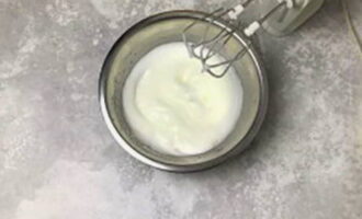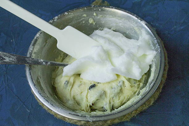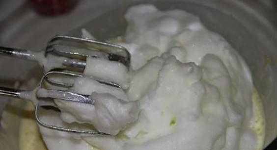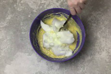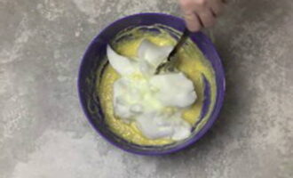 - Voeg vervolgens de opgeklopte eiwitten toe aan de kom, roer tot een gladde massa.