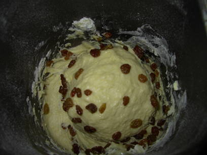 - Kies in het broodmachinemenu het programma Basis Brood, medium korst. Voeg na het eerste kneden de rozijnen toe aan de broodbakmachine.