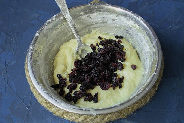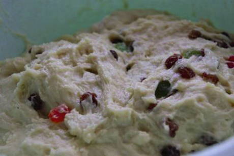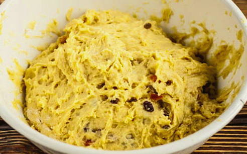 - Giet kokend water over de rozijnen, was en droog. Voeg rozijnen en gekonfijt fruit toe aan het deeg, meng.