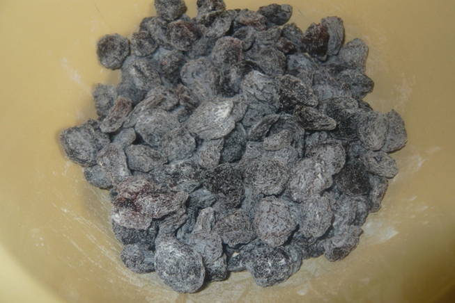 Week de rozijnen 10 minuten in heet water, was ze, droog ze en rol ze door de bloem.