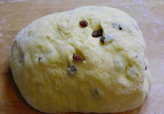 - Was de rozijnen met heet water, droog en voeg toe aan het gegroeide deeg, meng.
