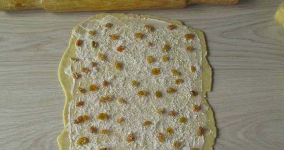 - Verdeel het deeg in stukken, rol ze elk op, bestrijk ze met zachte boter, bestrooi met kokos en rozijnen.
