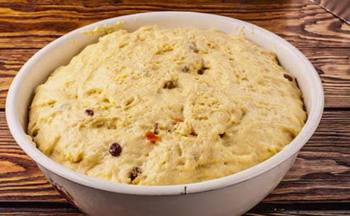 - Combineer het gist- en eimengsel. Voeg vervolgens de gezeefde bloem toe en kneed het deeg. Voeg vervolgens gedroogde vruchten toe en roer. Als het deeg goed gekneed is, doe het dan in een kom, dek af met een handdoek en laat 1,5 uur op een warme plaats staan.