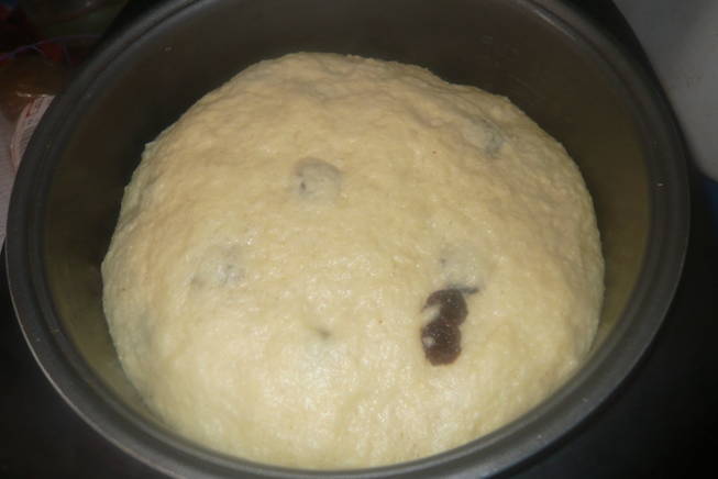 - Vet de kom van de multikoker in met boter, leg het deeg erin. Schakel de modus "Verwarmen" gedurende 10 minuten in.