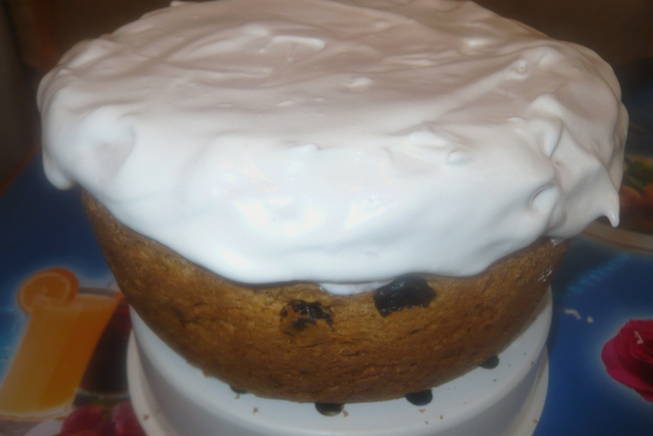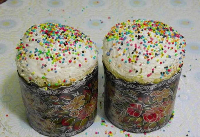 - Bak de cakes 60 minuten in de oven op 210 graden. Om de cakes te versieren, klop je het eiwit en een paar eetlepels suiker. Smeer gebakken goederen met glazuur en bestrooi met suikerwerkhagelslag.