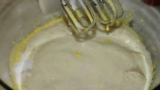 - Klop de eieren en suiker apart tot ze licht zijn. Voeg de eiermassa toe aan het deeg.