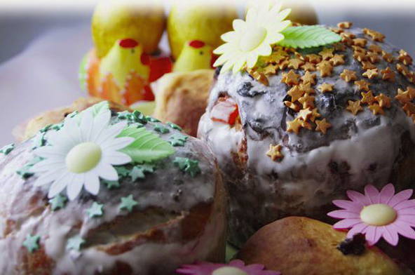 Paascakes worden gemaakt van gistdeeg. Om het deeg goed en snel te laten rijzen, kun je het beste droge snelwerkende gist gebruiken. De gebakken goederen zijn luchtig en zacht.