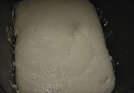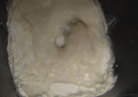 - Doe de helft van de gezeefde bloem en gist, eerder verdund in warme melk, in een emmer van een broodmachine. Activeer het Broodprogramma en wacht tot de broodbakmachine het deeg heeft gekneed.