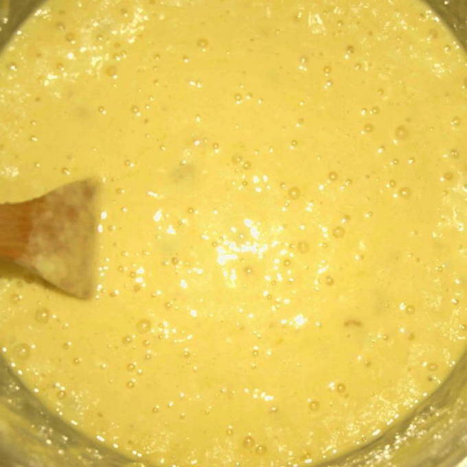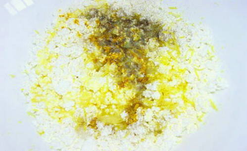- Combineer wrongel met gesmolten boter, zout, vanille, citroenschil en kurkuma.