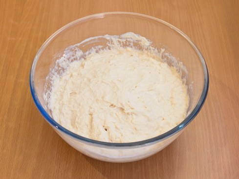 - Als het deeg omhoog komt, meng je het met de wrongelmassa.
