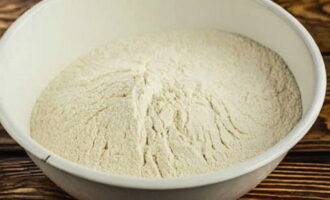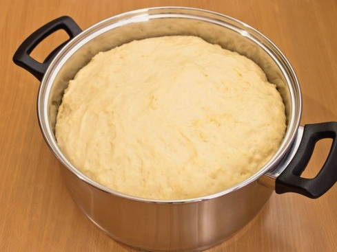 - Giet de gezeefde bloem bij het deeg. Meng het deeg met bloem tot een glad mengsel en laat het een half uur op een warme plaats staan, afgedekt met een handdoek.