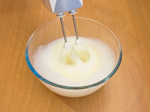 - Klop de eiwitten met een snufje zout tot een luchtig wit schuim.