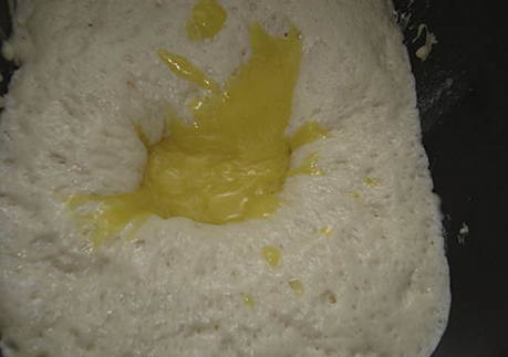 - Als het deeg omhoog komt, activeer dan het programma Basisbrood en voeg de dooier-botermassa toe aan de emmer.