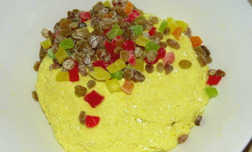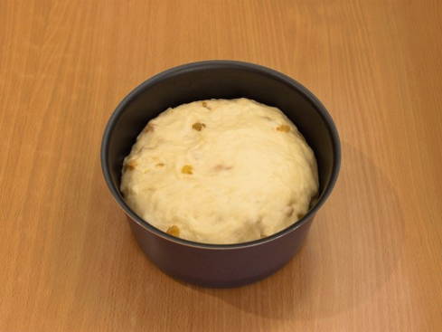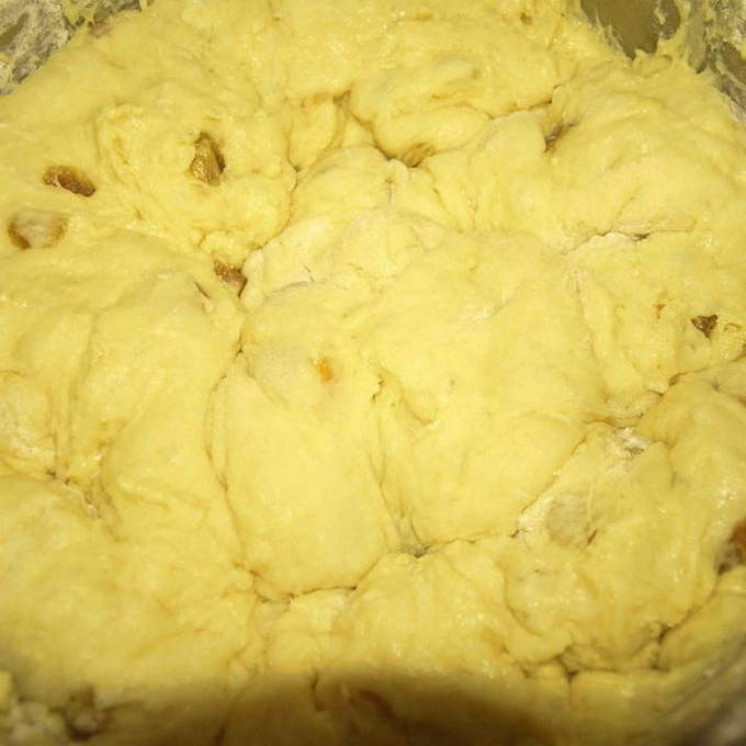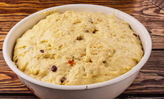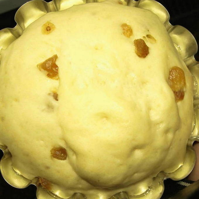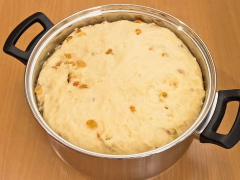 - Meng het goed gegroeide deeg met de dooiermassa. Voeg gezeefde bloem en rozijnen toe, kneed het deeg. Zet het 40-60 minuten op een warme plaats om te rijzen. Roer het deeg vervolgens met je handen en laat het opnieuw rijzen.