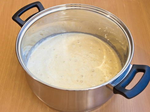 - Verkruimel de gist tot warme melk, voeg de helft van de suiker, het zout en 250 gram gezeefde bloem toe. Roer de ingrediënten en plaats op een warme plaats. Als het deeg rijst, laat je het zakken, doe het nog een paar keer.