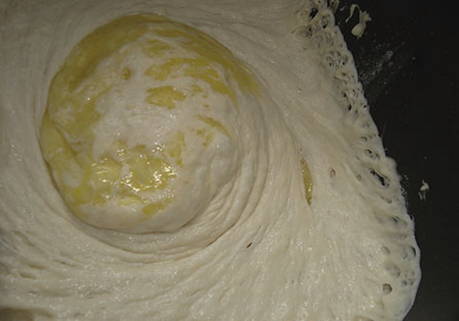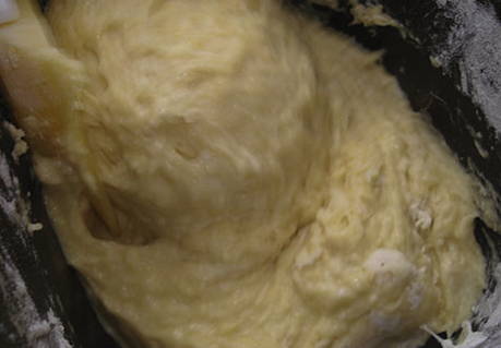 - Wanneer de massa min of meer homogeen wordt, voeg dan het tweede deel van de bloem toe.