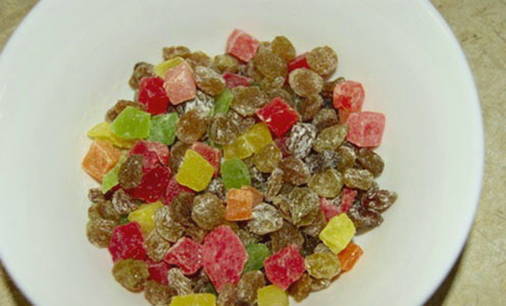 - Bestrooi rozijnen en gekonfijte vruchten met bloem.