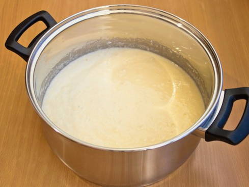 - Maak een deeg. Voeg bloem, suiker en gist toe aan de warme melk, roer en laat 15-20 minuten op een warme plaats staan.