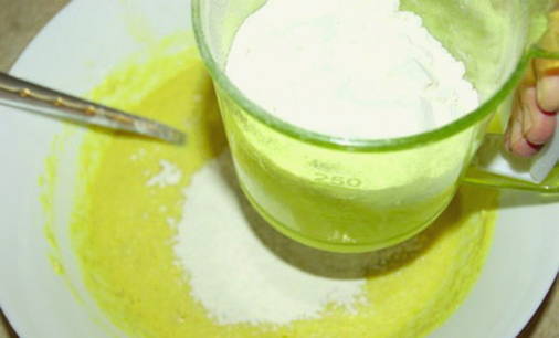 - Scheid de eiwitten van de dooiers. In het recept heb je geen eiwitten nodig, je kunt er glazuur van maken ter decoratie. Smelt de margarine op laag vuur, koel af, meng met de dooiers, de resterende suiker en vanillesuiker.
