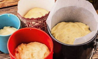 - Verdeel het afgewerkte deeg in geoliede bakvormen. Laat de vormen met het deeg een half uur op een warme plaats staan voordat ze in de oven worden geplaatst.