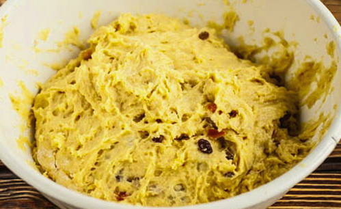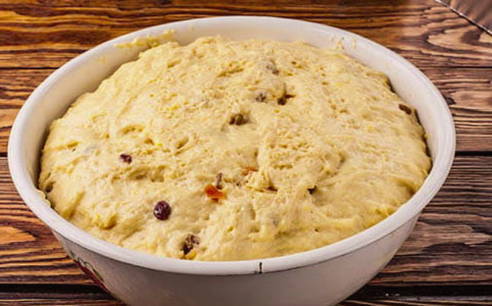 - Meng het goed gegroeide deeg met de dooiermassa. Voeg gezeefde bloem en rozijnen toe, kneed het deeg. Zet het 40-60 minuten op een warme plaats om te rijzen. Roer het deeg vervolgens met je handen en laat het opnieuw rijzen.