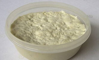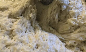 - Voeg vervolgens 200-250 gram gezeefde bloem toe en meng. Dek de kom af met een handdoek en laat 15-25 minuten op een warme plaats staan.