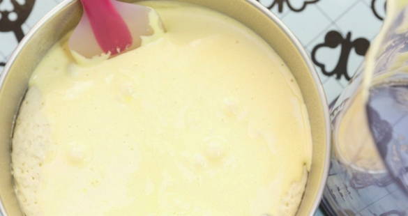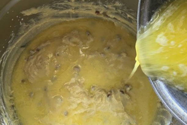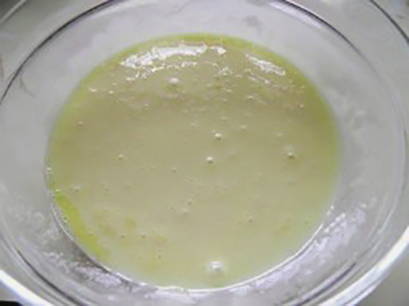 - Klop de eieren apart met de resterende suiker tot ze licht zijn. Voeg vervolgens gesmolten boter toe aan de losgeklopte eieren en roer.