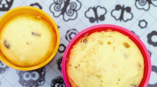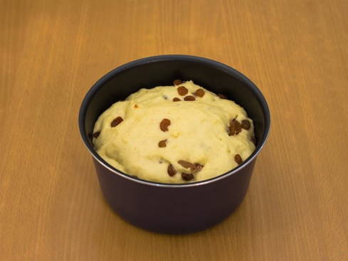 Voeg rozijnen toe aan het bij elkaar passende deeg, meng goed en laat 10 minuten staan. Vet de ovenschalen in met olijfolie, vul ze voor 1/3 met deeg. Laat het deeg nog 10-15 minuten in de vormen liggen.