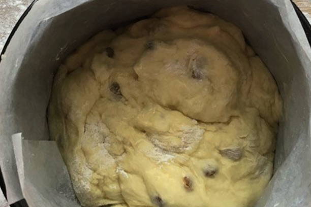 - Weelderige en luchtige paascake met rozijnen in een broodbakmachine