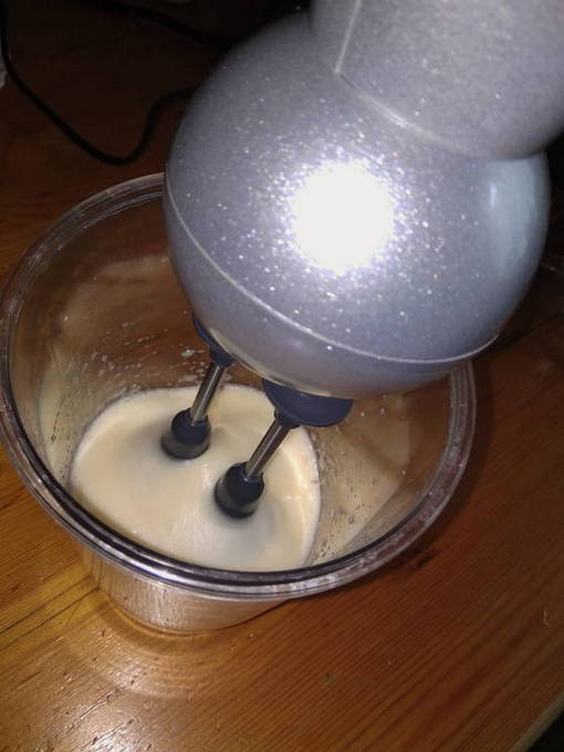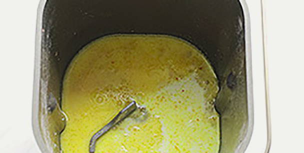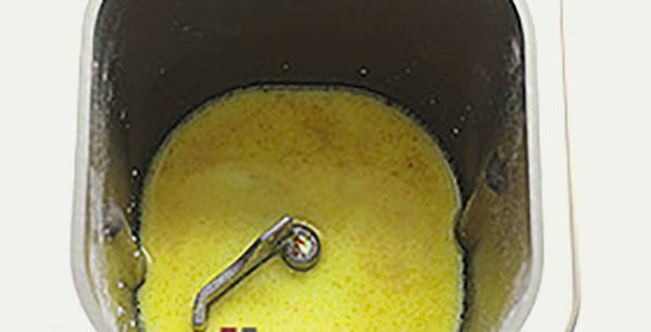 - Klop eerst de eieren tot een gladde massa en voeg dan de broodmachine toe aan de emmer.