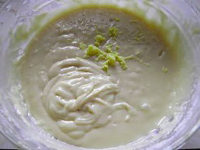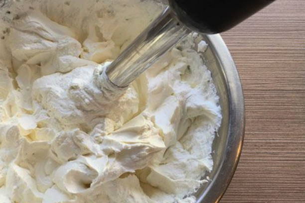 - Voeg vervolgens zachte boter en zure room toe aan een kom, roer.