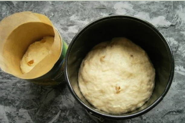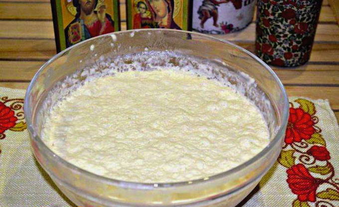 - Maak een deeg. Verwarm de melk en los hierin de droge gist op, voeg 250 gram bloem toe, meng, dek af met een handdoek en laat een half uur op een warme plaats staan. Gedurende deze tijd moet het deeg verdubbelen.