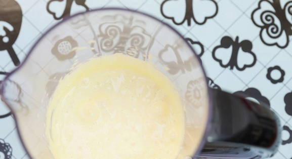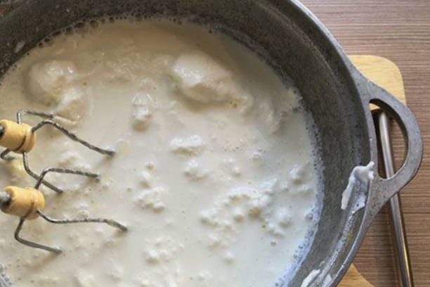 - Klop de eieren in een kom, voeg dan gecondenseerde melk toe en roer.