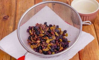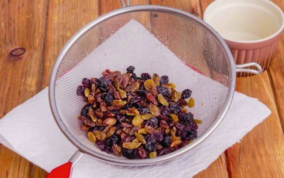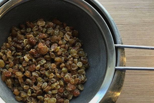 - Vul de rozijnen met heet water gedurende 10 minuten, was ze en droog ze af.
