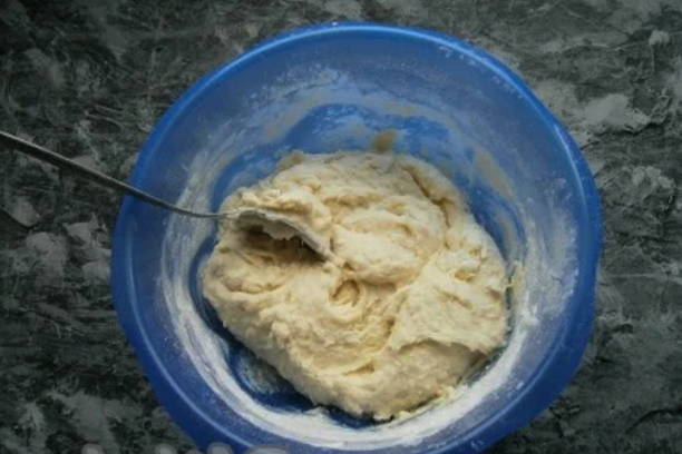 - Eerst moet je het deeg kneden. Meng in een kom een eetlepel suiker, gist, warme melk en 3-4 eetlepels bloem. Dek de kom af met een handdoek en laat een half uur op een warme plaats staan.