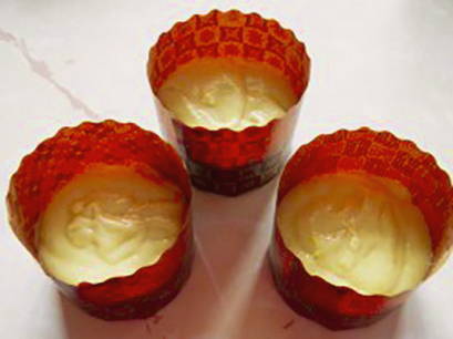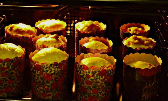 - Vul de vormen voor 1/3 met deeg. Plaats de vormen met het deeg in de oven, voorverwarmd op 200 graden, gedurende 30-40 minuten.