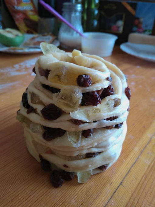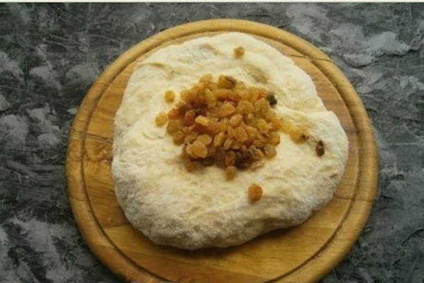- Wanneer het deeg omhoog komt, kreukt u het met uw handen, verdeelt u het in tweeën, dek het af met een handdoek en laat u het 15 minuten staan. Rol elk deel van het deeg uit tot een dunne rechthoekige cake. Bestrijk het deeg met zachte boter en bestrooi met rozijnen en marmelade.