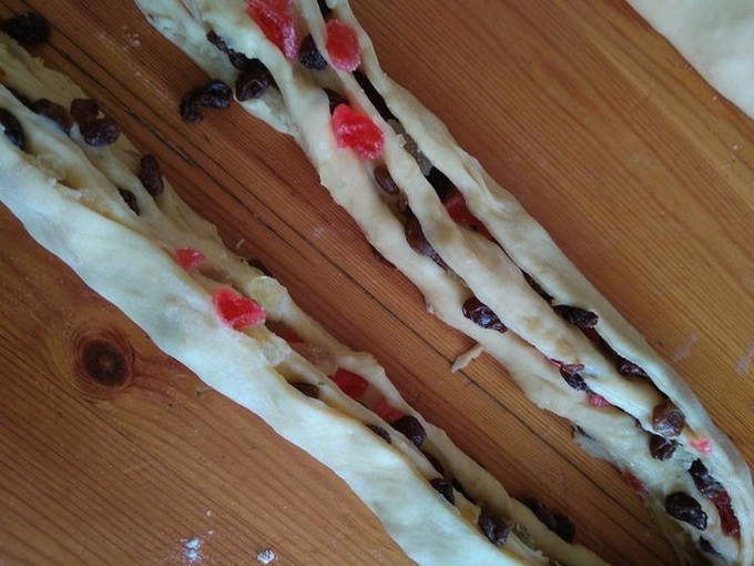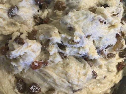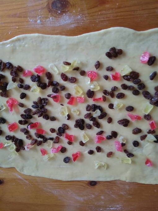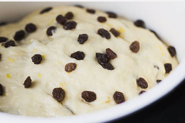 - Voeg vervolgens de gewassen en gedroogde rozijnen toe aan het deeg, meng. Geef het deeg nog een half uur om te rijzen.