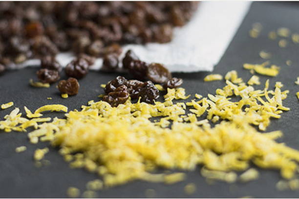 - Was de citroen grondig en rasp de schil op een fijne rasp. Week de rozijnen 15 minuten in warm water, spoel ze af en droog ze af.