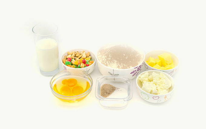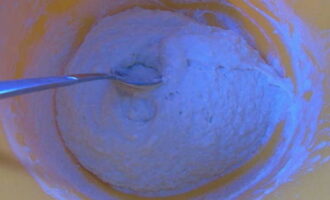 - Meng in een kom gezeefde bloem, snelwerkende gist, suiker, vanillesuiker, eieren, kwark en zachte boter.