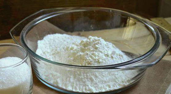 - Verwarm de melk tot 33-35 graden, plet de gist erin, voeg suiker en 200 gram bloem toe, meng en laat een half uur op een warme plaats staan.