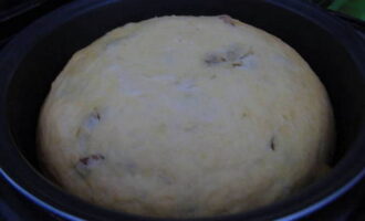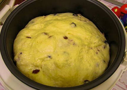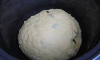 - Voeg de rozijnen toe aan het deeg, roer en laat het deeg 1 uur warm staan. Nadat het deeg goed is gegroeid, plaatst u het in de kom van de multikoker. Vet de kom in met boter.