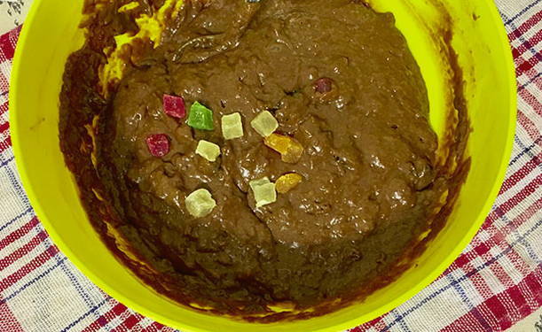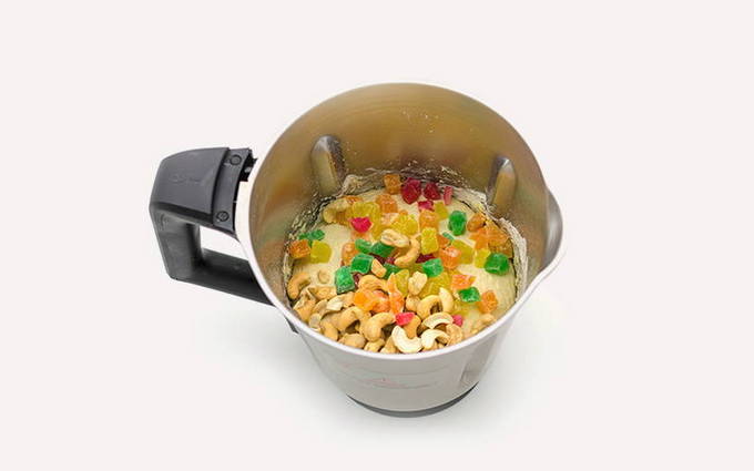 - Voeg gekonfijt fruit en cashewnoten toe aan het deeg, meng opnieuw goed.