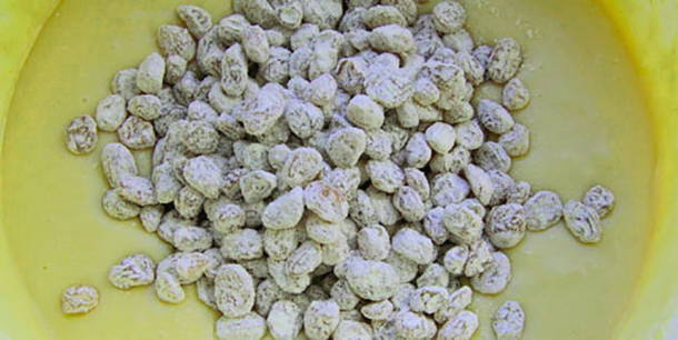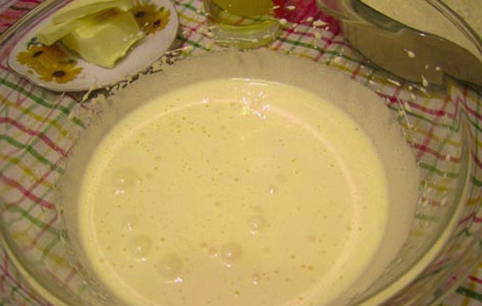 Verwarm de melk, voeg een eetlepel suiker, gist en 250 gram gezeefde bloem toe. Roer de ingrediënten door elkaar en laat 30 minuten warm staan.