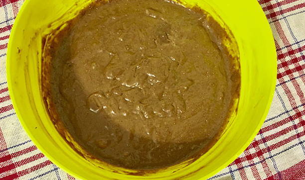 - Voeg gesmolten boter, chocolademilkshake en eiermassa toe aan het droge mengsel. Meng alles goed. Bedek het resulterende deeg met een handdoek en laat het 2 uur warm staan.