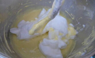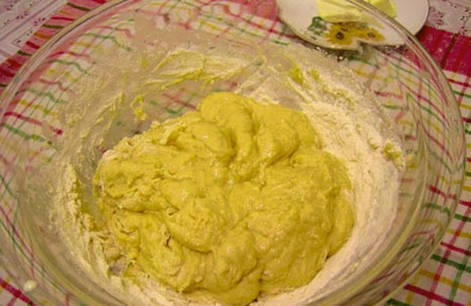 - Meng het deeg en de eiermassa. Voeg vervolgens de gezeefde bloem in porties toe, begin met het kneden van het deeg.