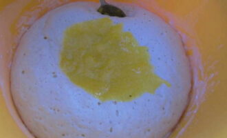 - Voeg vervolgens zachte boter toe en meng volledig door het deeg. Dek het vervolgens af met een handdoek en laat het 40-60 minuten op een warme plaats rijzen.