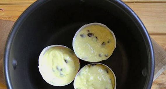 - Vet de vormen in met olie, vul ze voor 2/3 van het deeg en plaats ze in de kom van de multikoker.
