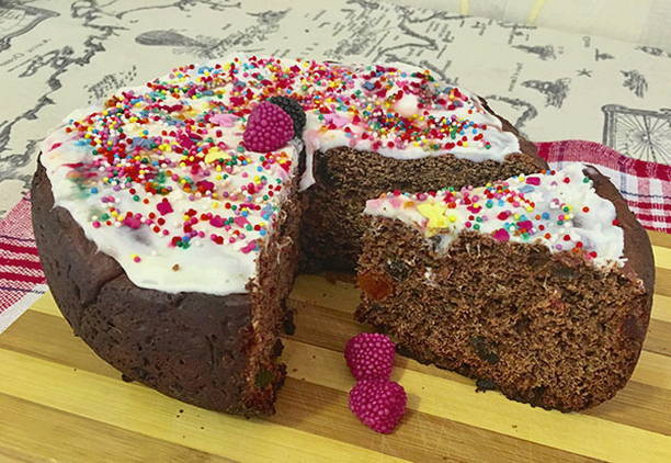 - Bak de chocoladetaart 60 minuten op de bakstand. Koel de afgewerkte cake, versier met glazuur, hagelslag en vers fruit.